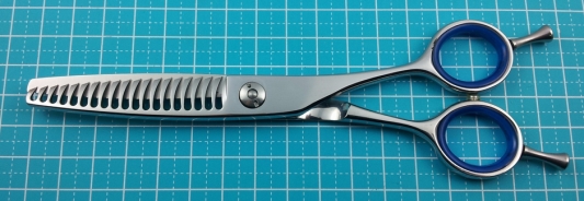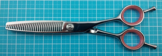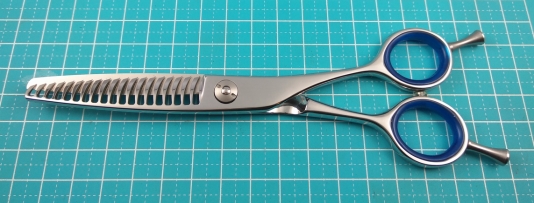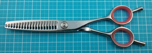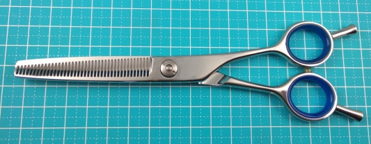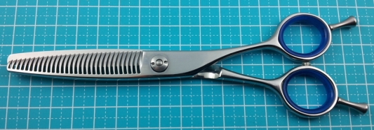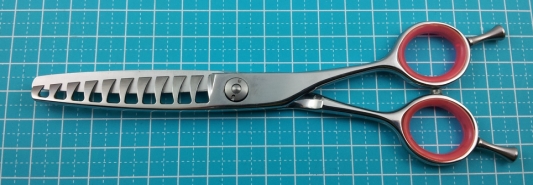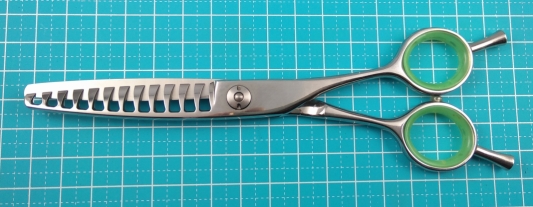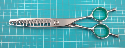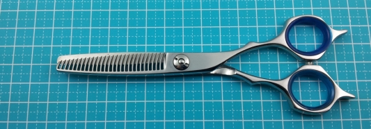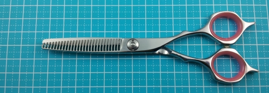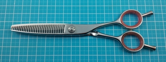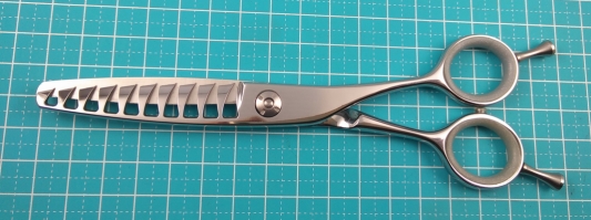 いわゆる普通の梳き鋏のタイプです。ただ、いまはこの溝の形状がいろいろあり、各メーカーが、いろいろと工夫をしている部分でもあります。